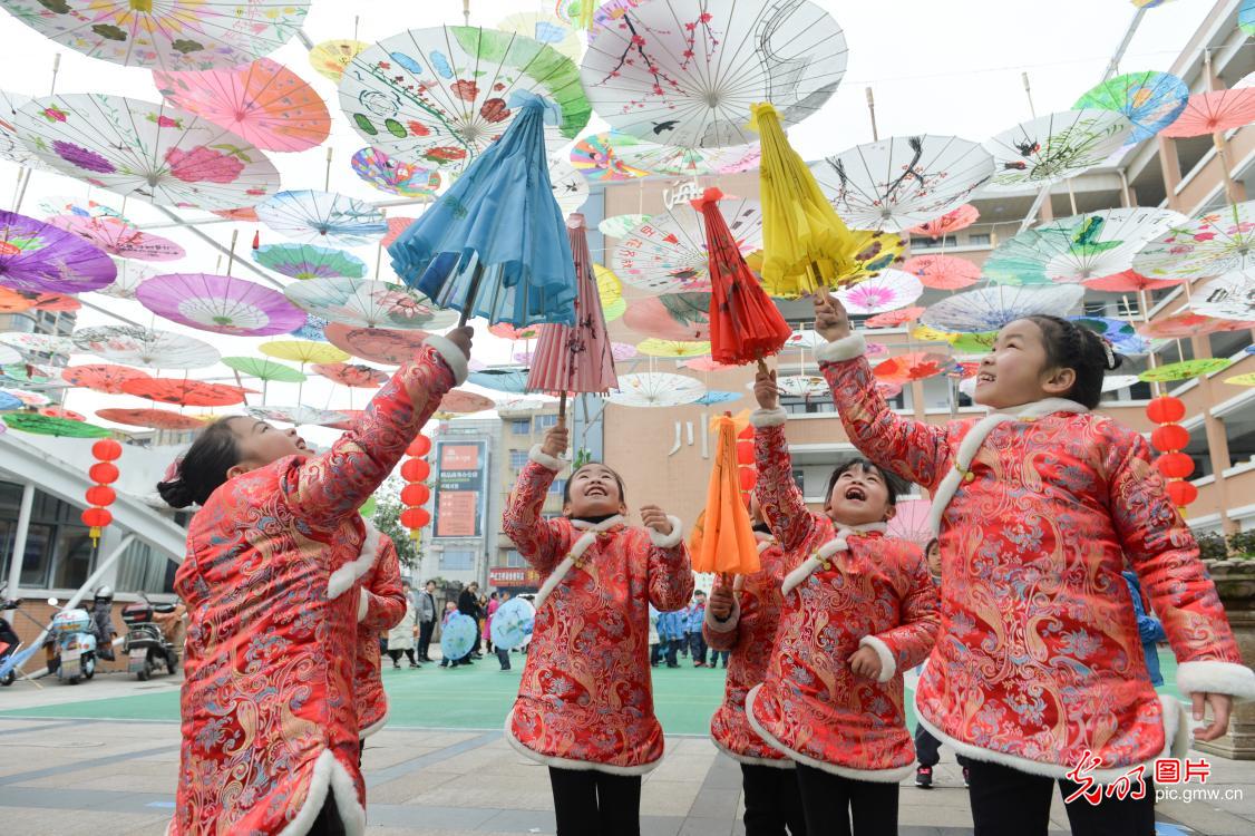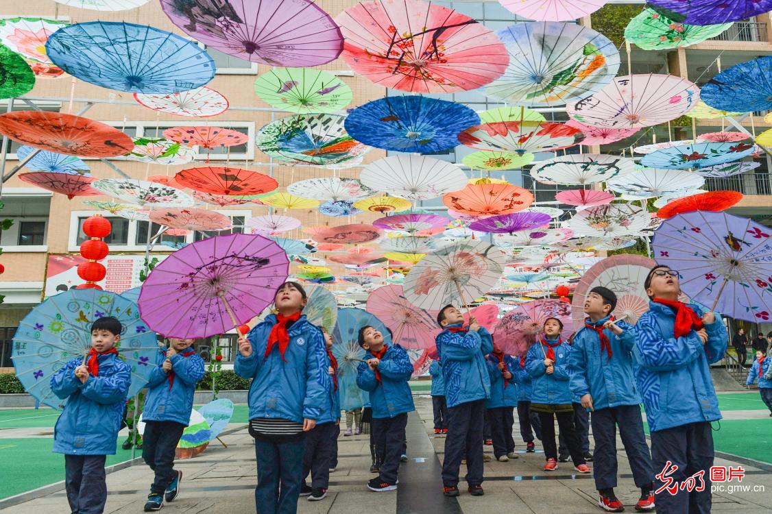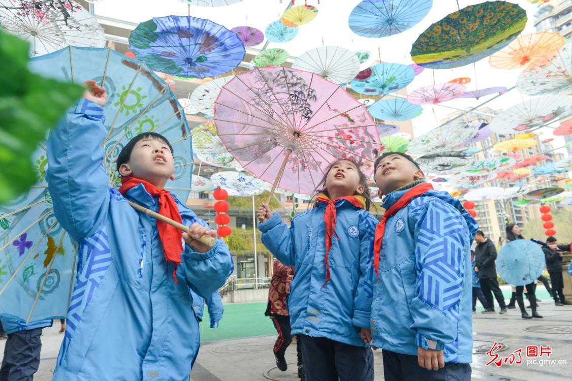 2019年2月19日,浙江省長興縣長興一小縣前街校區(qū)開展"紙傘綻放迎開學"活動,一千余把油紙傘裝扮校園,迎接開學。據(jù)悉,這些油紙扇都是學生們寒假里動手繪制而成,旨在讓孩子們感受傳統(tǒng)文化的獨特魅力。(吳拯攝/光明圖片)