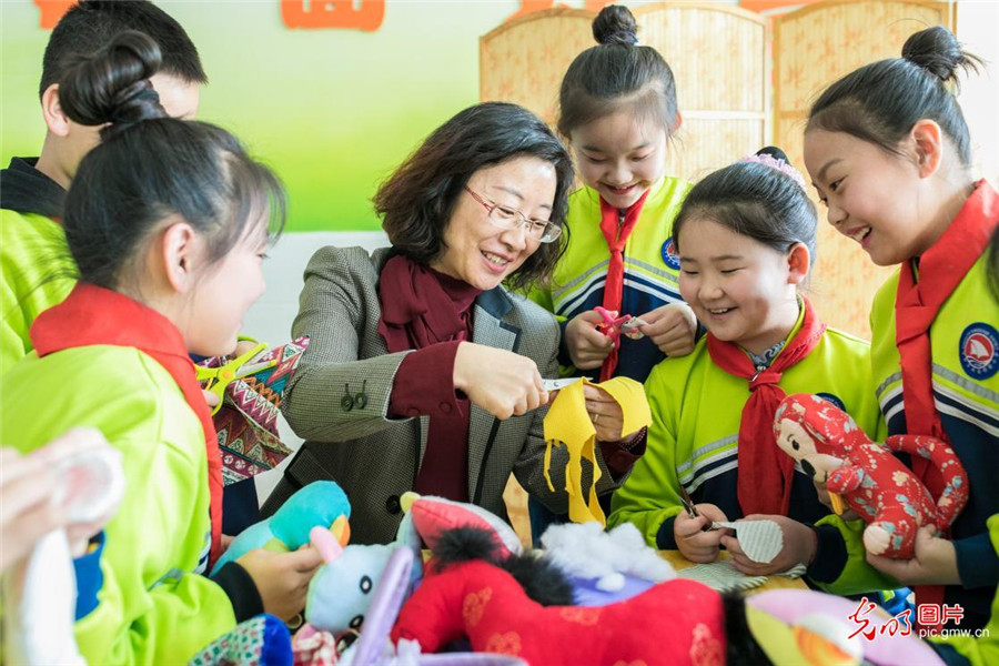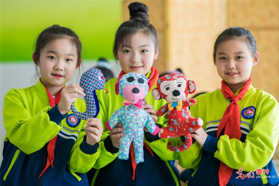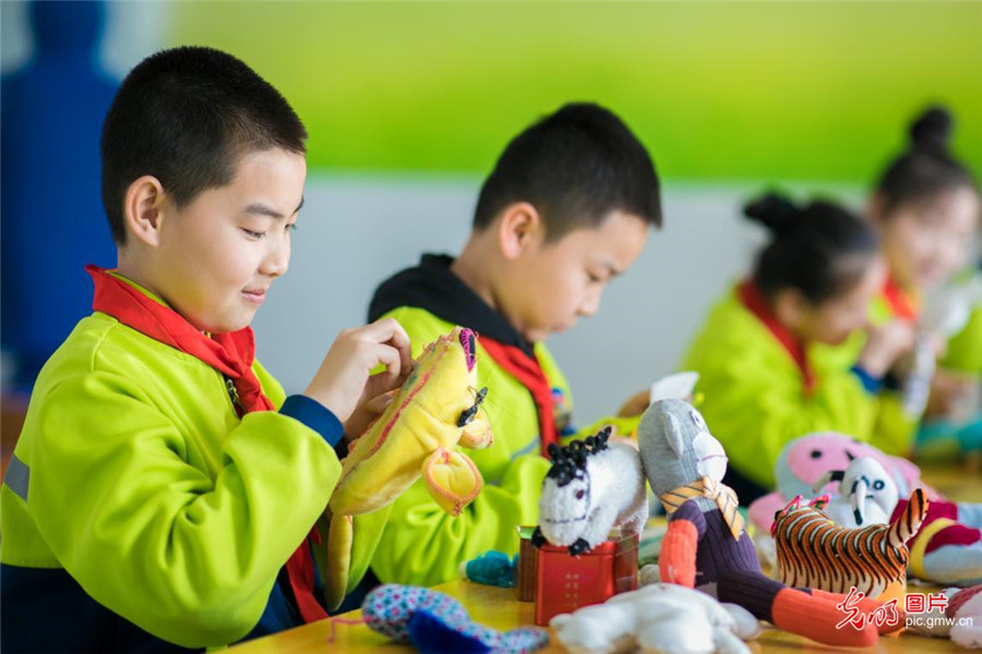 2019年3月18日,內(nèi)蒙古呼和浩特市玉泉區(qū)通順街小學開設(shè)宣傳低碳環(huán)保理念的手工小課堂,孩子們在老師的帶領(lǐng)下,利用身邊的廢舊布頭,絲綿、紐扣等制作小布藝作品,培養(yǎng)孩子們勤儉節(jié)約和低碳環(huán)保的意識。(丁根厚攝/光明圖片)