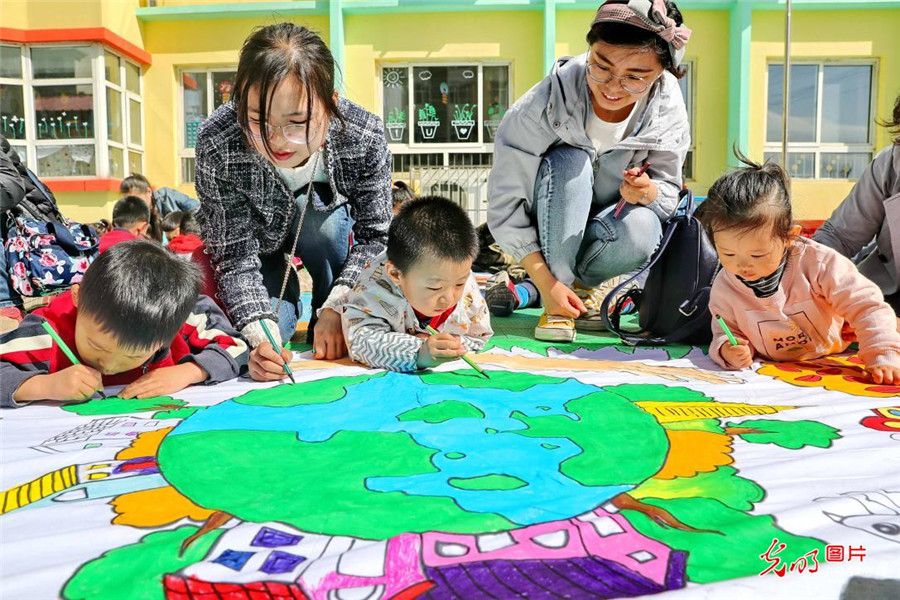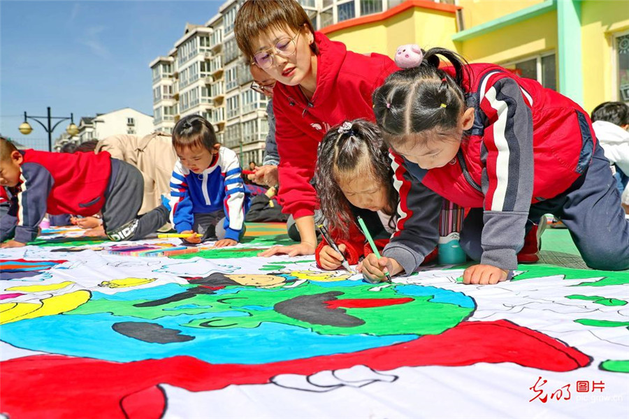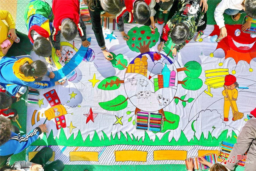2019年4月18日,河北省秦皇島市海港區(qū)社區(qū)居民和小朋友共同彩繪長卷。此次活動由社區(qū)居民帶領轄區(qū)幼兒園小朋友用五彩畫筆在百米白色畫卷上畫出自己眼中的美麗地球,增強未成年人保護生態(tài)環(huán)境和愛護地球的意識。(