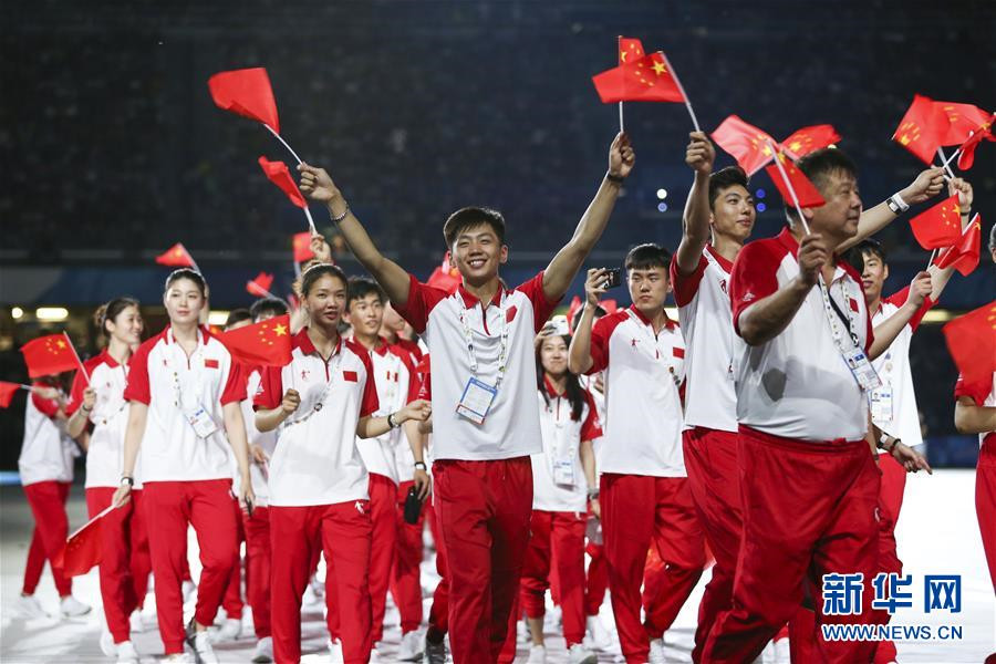 7月3日,中國大學生體育代表團在開幕式上入場。新華社記者孟永民攝