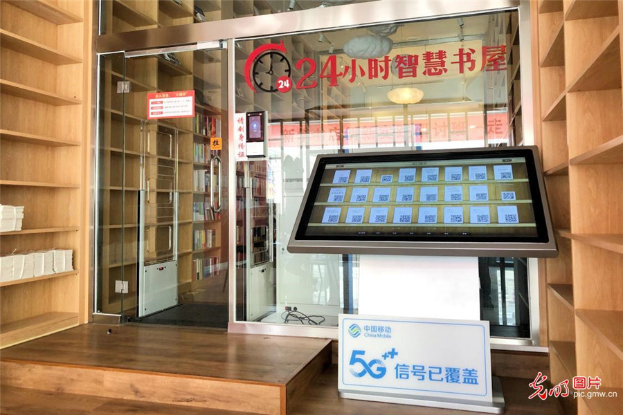 2019年7月2日,河北雄安新區(qū)容城縣新華書店。近日,由河北移動聯(lián)合新華書店打造的24小時5G無人智慧書店在雄安新區(qū)容城縣新華書店成功試點運營,為顧客創(chuàng)造了更便捷、更智慧的購書、閱讀體驗。(賈昕曈攝/光明圖片)