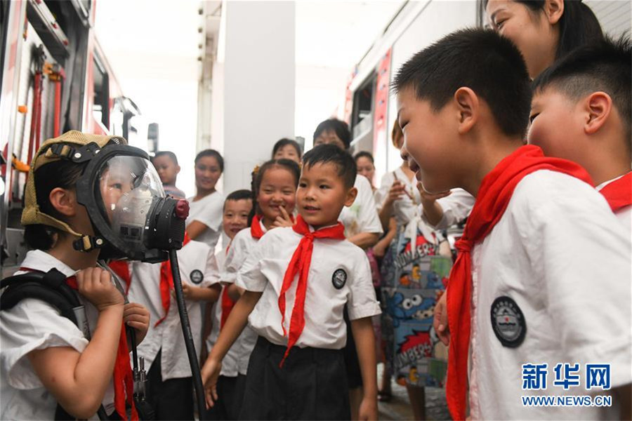 7月17日,小學(xué)生在體驗(yàn)消防救援裝備。 當(dāng)日,安徽省合肥市逍遙津小學(xué)組織學(xué)生及家長走進(jìn)合肥市消防救援支隊(duì)特勤大隊(duì)一中隊(duì),通過學(xué)習(xí)消防知識(shí),提高安全自救意識(shí)。 新華社記者 張端 攝