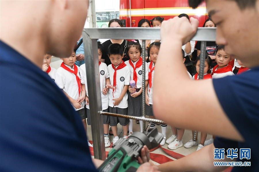 7月17日,消防隊(duì)員(前)在給小學(xué)生演示如何操作消防救援工具。 當(dāng)日,安徽省合肥市逍遙津小學(xué)組織學(xué)生及家長走進(jìn)合肥市消防救援支隊(duì)特勤大隊(duì)一中隊(duì),通過學(xué)習(xí)消防知識(shí),提高安全自救意識(shí)。 新華社記者 張端 攝