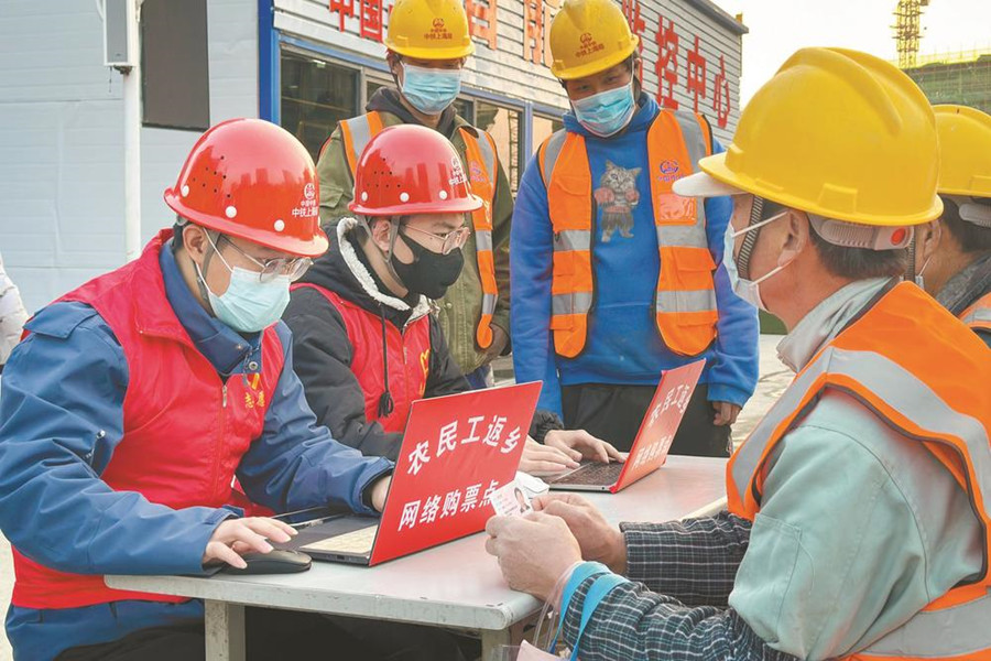 1月7日,中鐵上海局三公司創(chuàng)智天地項(xiàng)目部組織青年志愿者在工地設(shè)立農(nóng)民工購票服務(wù)點(diǎn),幫助不會(huì)上網(wǎng)的農(nóng)民工兄弟購買返鄉(xiāng)車票,溫暖民工回家路。記者 李博 通訊員 龔邵李 攝
