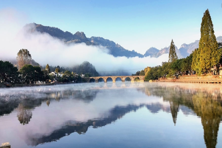 10月24日早晨,在休寧縣齊云山旅游特色小鎮橫江江畔拍攝的景色。當日是霜降節氣的第二天,休寧縣橫江齊云山段水面水霧繚繞,云山詩意與古村、古橋相映成景,宛若仙境。王運選/攝