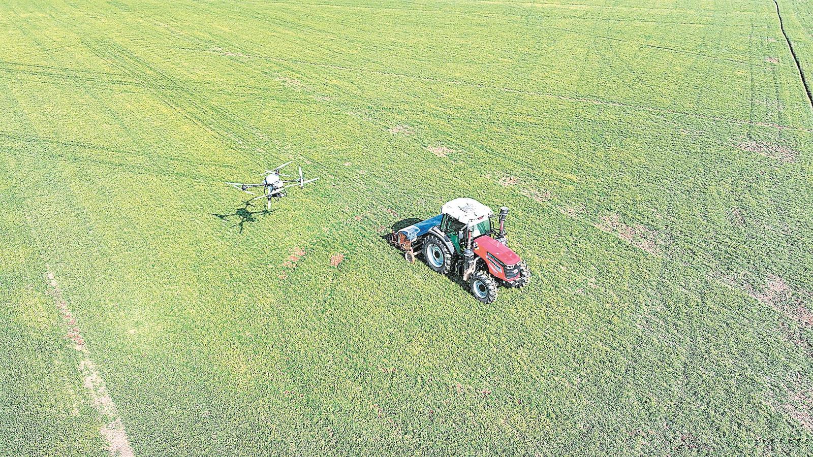 2月4日,蚌埠市五河縣頭鋪鎮(zhèn)東來家庭農(nóng)場,農(nóng)民操作農(nóng)機和無人機給小麥施肥。 通訊員 李向前 攝