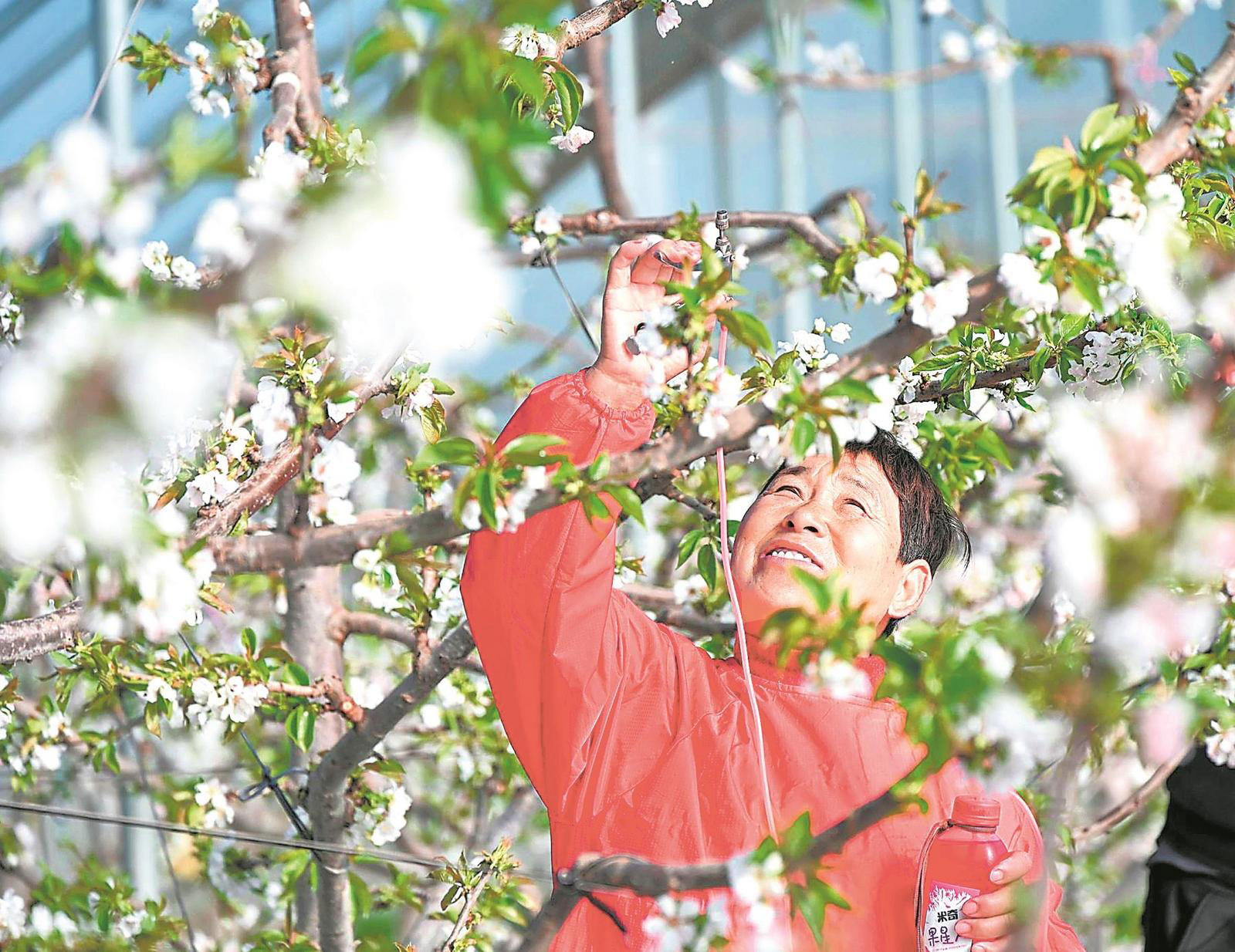 2月7日,宿州市碭山縣李莊鎮(zhèn)鎮(zhèn)東村果農(nóng)在車厘子大棚內(nèi)為花朵進行人工授粉。通訊員 崔猛 攝