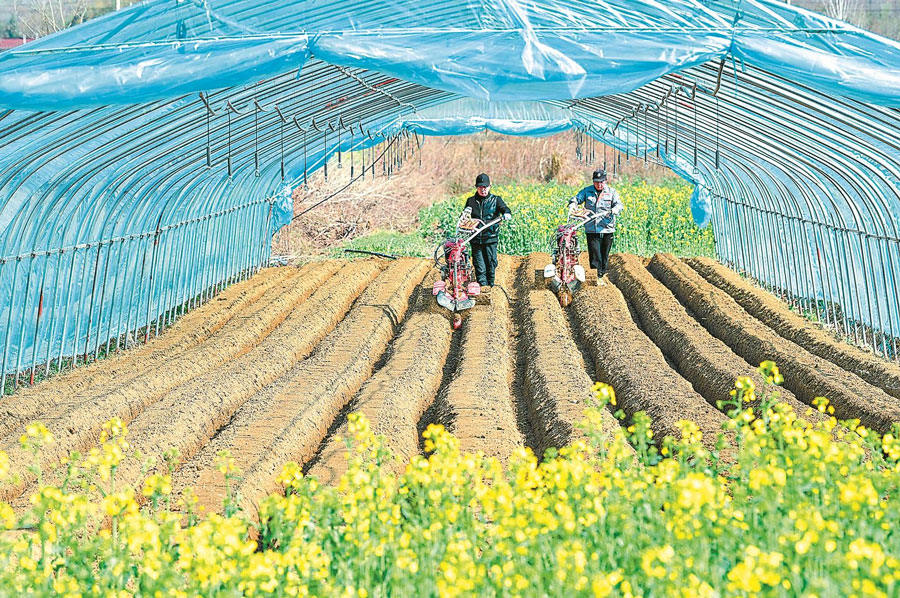 3月17日,在銅陵市義安區(qū)天門(mén)鎮(zhèn)一處種植白姜的大棚里,姜農(nóng)正在操控起壟機(jī)對(duì)姜田進(jìn)行挖溝起壟,為銅陵白姜的春種做準(zhǔn)備。 通訊員 儲(chǔ)著傳 攝