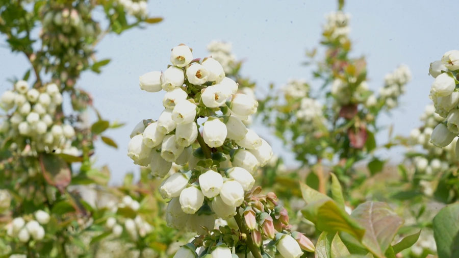 ??眼下,安徽省懷寧縣9.3萬畝藍莓花開正濃,一株株藍莓樹亭亭玉立,形似小燈籠的藍莓花潔白如玉、黃蕊含羞、嬌小可愛、沁香四溢,鋪滿山崗。