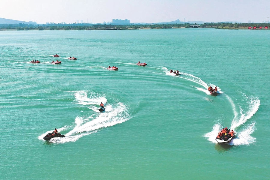5月11日,救援人員在淮北市綠金湖參加水上救援演練。在5月12日第17個全國防災減災日到來之際,淮北市暨相山區防災減災應急演練在綠金湖舉行,以提升防災減災綜合應急處置能力。