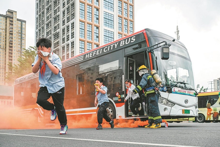 5月9日,在合肥公交集團榮城花園公交站,來自六安路小學榮城花園分校的小學生通過模擬公交車失火逃生、學習消防器材使用等方式,提升防災減災能力。