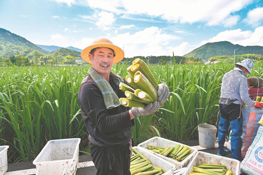 7月13日,在岳西縣石關(guān)鄉(xiāng)馬畈村,當?shù)夭宿r(nóng)正在采收高山茭白。近年來,茭白成了岳西縣農(nóng)民增收的重要產(chǎn)業(yè)。 通訊員 王先國 攝