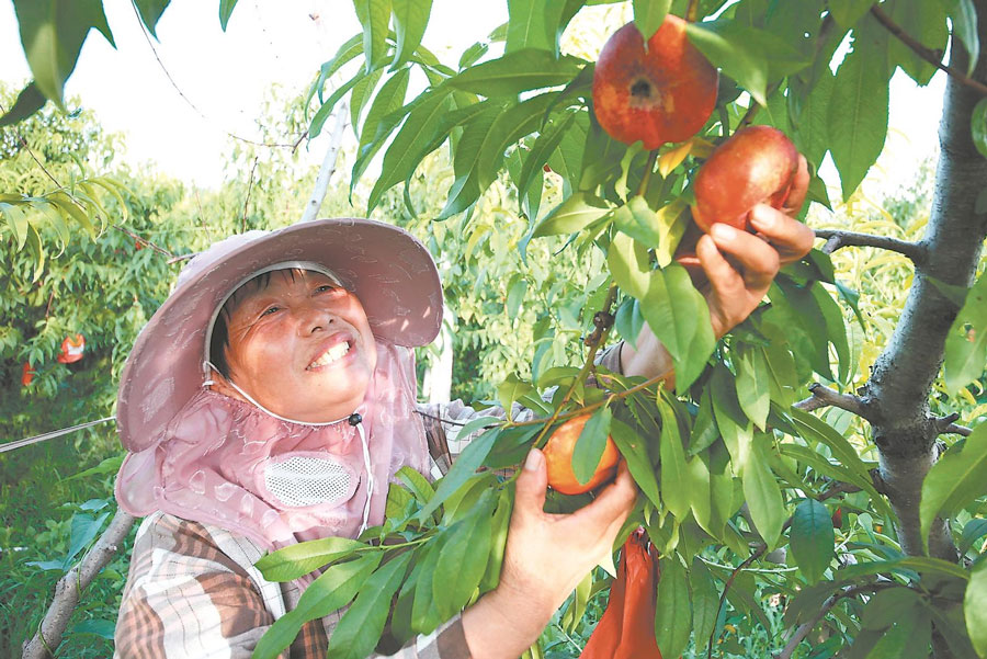 7月4日,淮北市杜集區(qū)石臺鎮(zhèn)劉莊村,果農(nóng)搶抓晴好天氣采摘蟠桃。近年來,當?shù)爻掷m(xù)推動蟠桃、黃桃等特色產(chǎn)品種植,帶動農(nóng)民增收。通訊員 劉棋 王倩雯 攝
