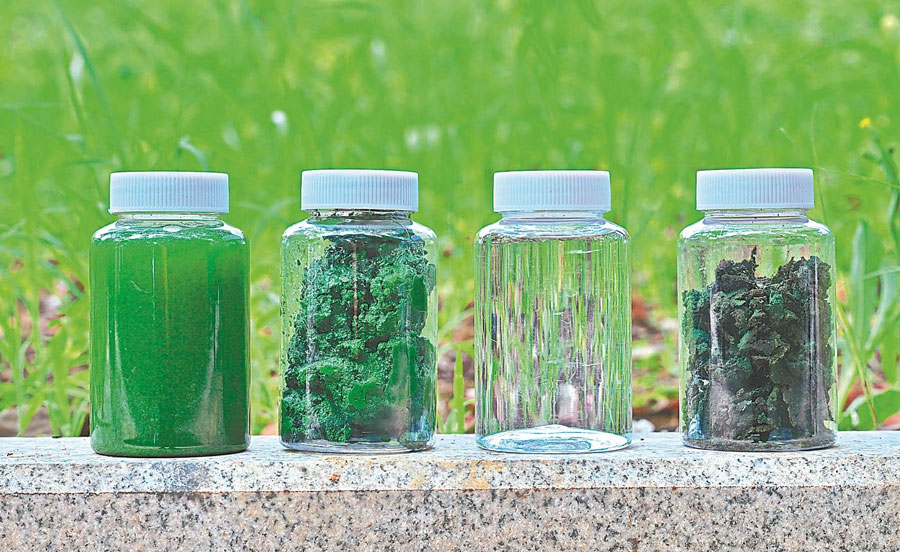 圖中樣本從左到右依次是藍藻藻水—藻泥—分離后的水—干燥后的“藻苔”。