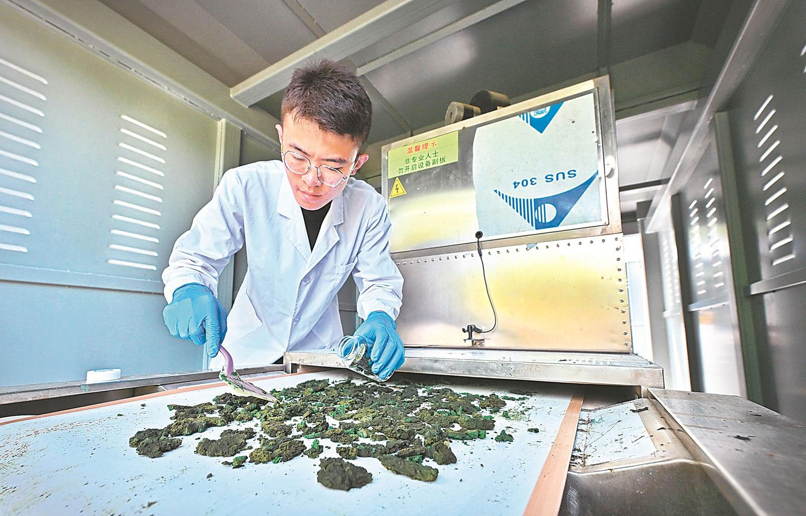 7月25日,合肥市包河區藍藻科普館外,技術人員將微波干燥后的“藻苔”裝瓶取樣。