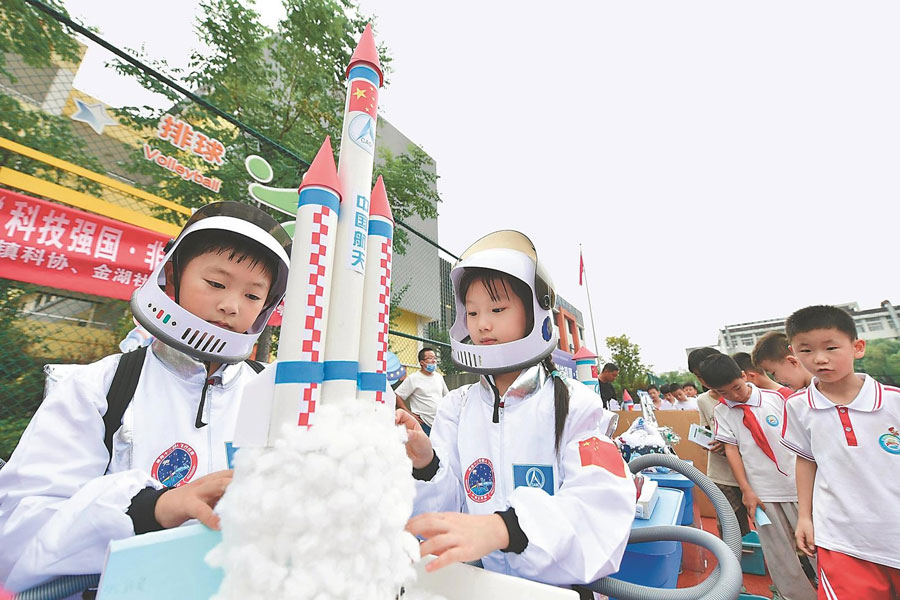 9月17日,蒙城縣莊子小學(xué)操場(chǎng),小學(xué)生在發(fā)射自己制作的“火箭”模型。當(dāng)天,該校舉辦科技文化節(jié),小學(xué)生競(jìng)相展示他們制作的各類(lèi)科普成果及小發(fā)明等。本報(bào)通訊員 胡衛(wèi)國(guó) 攝