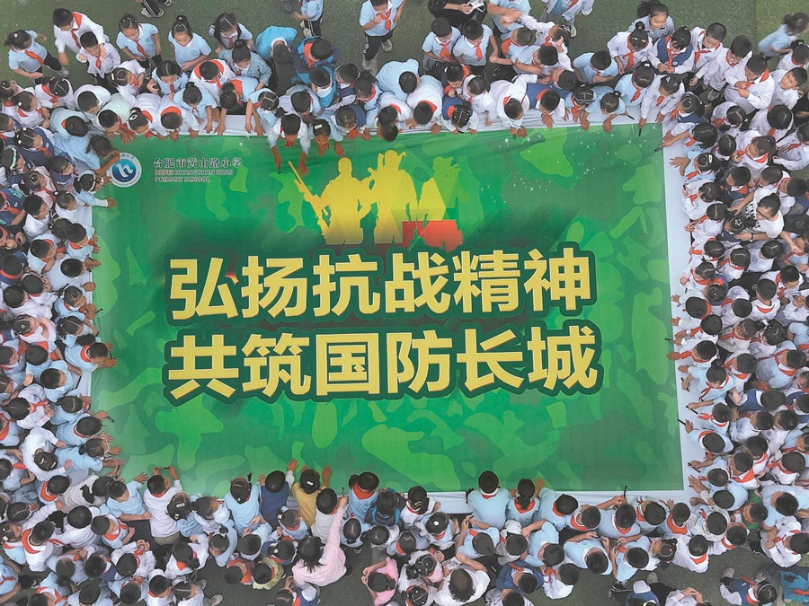 9月18日,合肥市黃山路小學學生在國防主題畫布上簽名。當天,該校開展“弘揚抗戰精神 共筑國防長城”國防教育進校園活動,引導學生樹立國防觀念,厚植愛國主義情懷。通訊員 葛宜年 攝