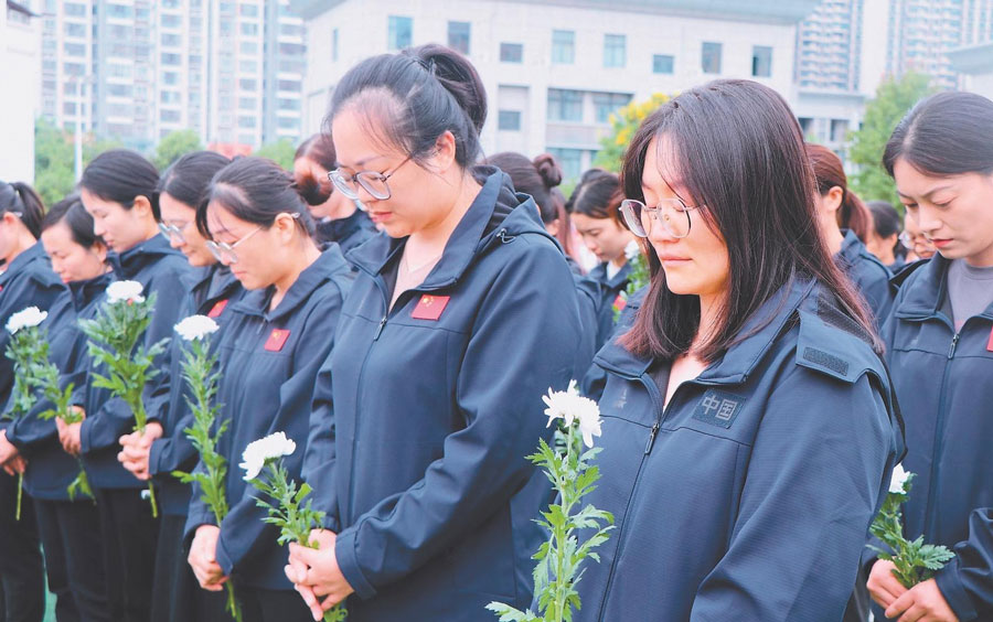 9月18日,伴隨著防空警報的拉響,阜陽市實驗小學北京路校區全體師生手捧潔白的菊花,整齊列隊,寄托哀思。特約攝影 王彪 通訊員 萬媛媛 攝