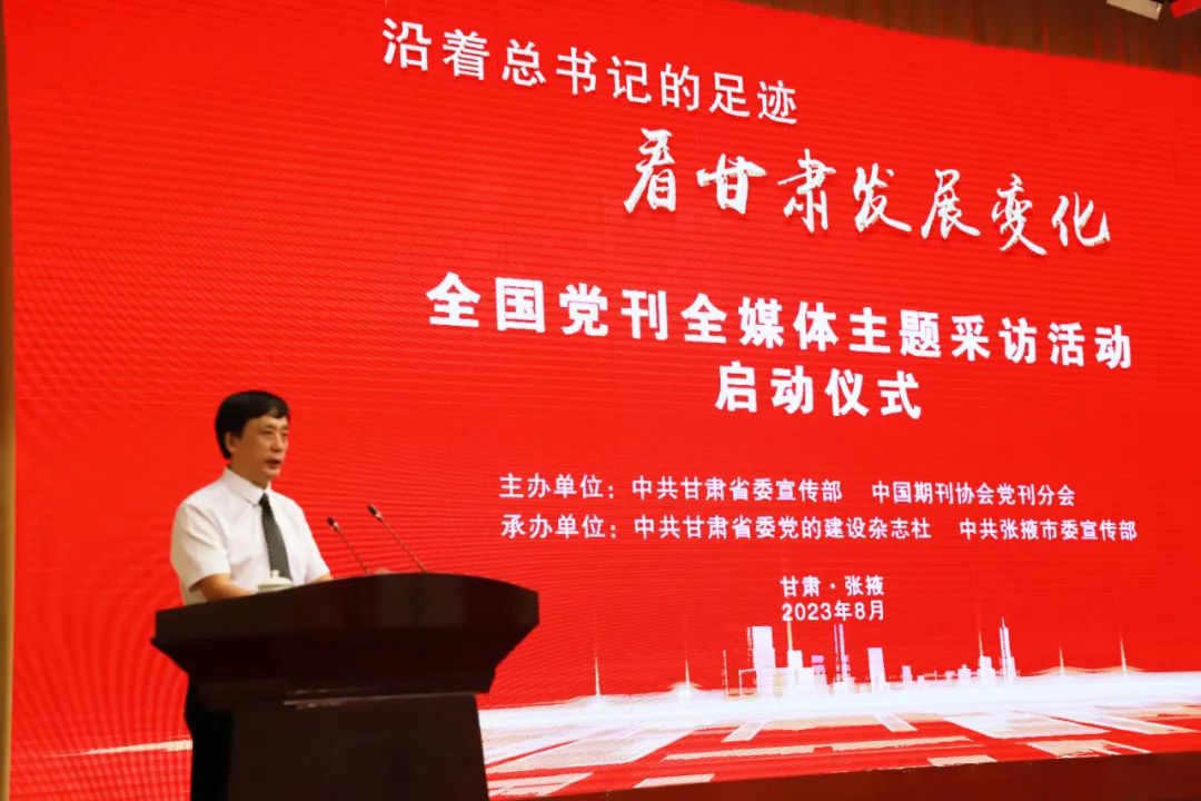 本網訊 八月隴原滿目新,感恩奮進正當時。為全面貫徹落實黨的二十大精神,深入開展學習貫徹習近平新時代中國特色社會主義思想主題教育,8月7日,“沿著總書記的足跡 看甘肅發展變化”全國黨刊全媒體主題采訪活動在甘肅省張掖市正式啟動。中國期刊協會會長吳尚之出席啟動儀式并講話,甘肅省委宣傳部、中國期刊協會黨刊分會、張掖市委宣傳部負責同志,《求是》《旗幟》、“學習強國”學習平臺等中央媒體及全國各省(區、市)黨刊社的負責同志和全媒體記者參加了啟動儀式。