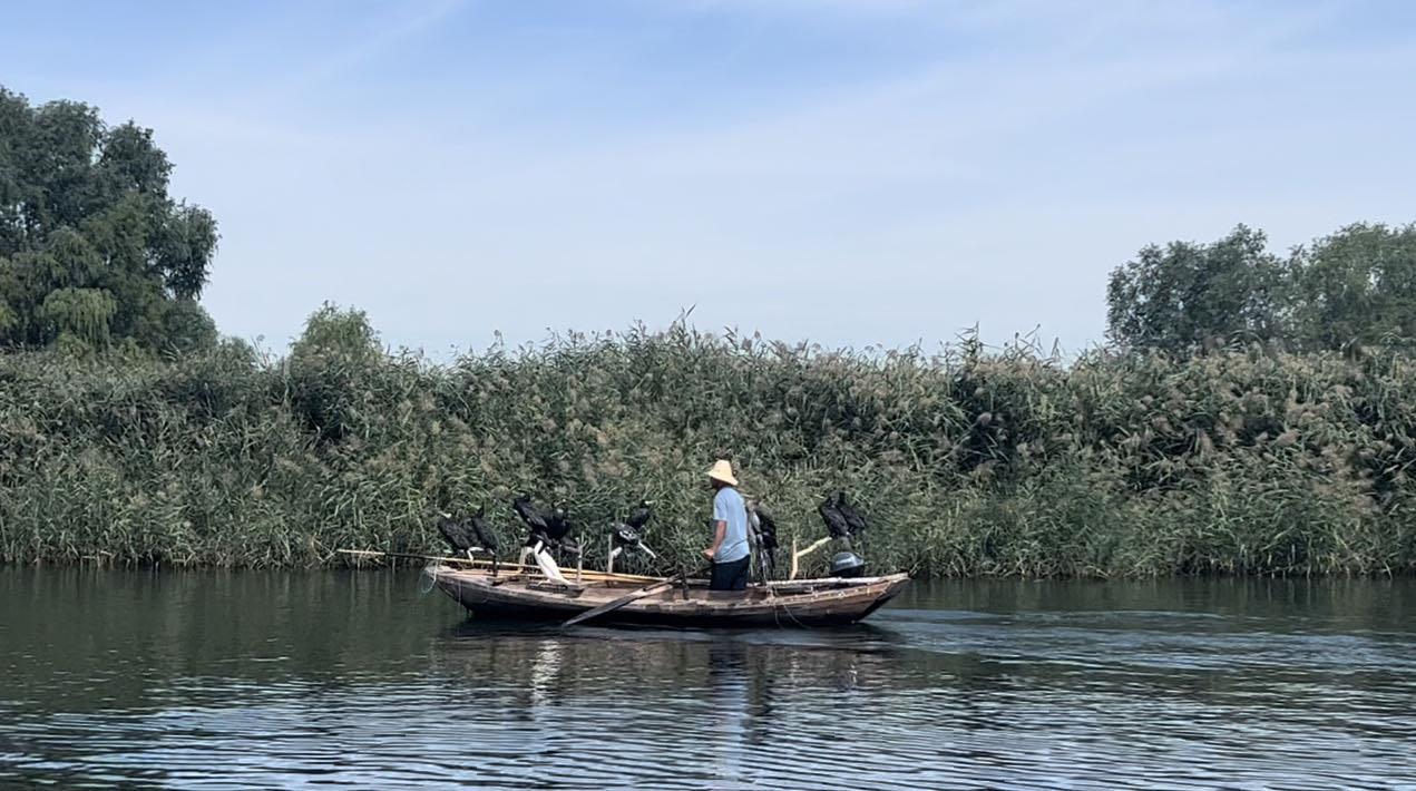 船行至白洋淀中,兩側蘆葦蕩漾、荷葉連連,撐船而過的漁民帶著滿船的鸕鶿往蘆葦蕩深處駛去,好一幅風景秀美、人與自然和諧共生的美好畫卷。